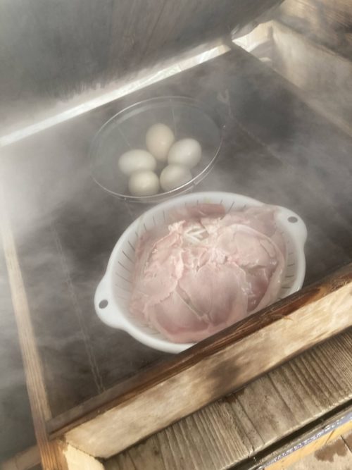 温泉の蒸気で卵や肉をセルフスタイルで蒸し上げる「鹿部温泉 蒸し釜料理」は大人気でなかなかの盛況ぶり。
