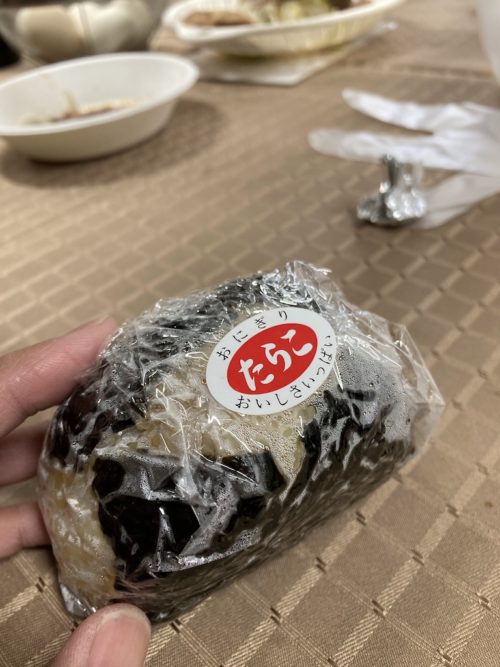 鹿部特産の大きなたらこおにぎりはめちゃうま。熱々の蒸し料理と一緒に!
